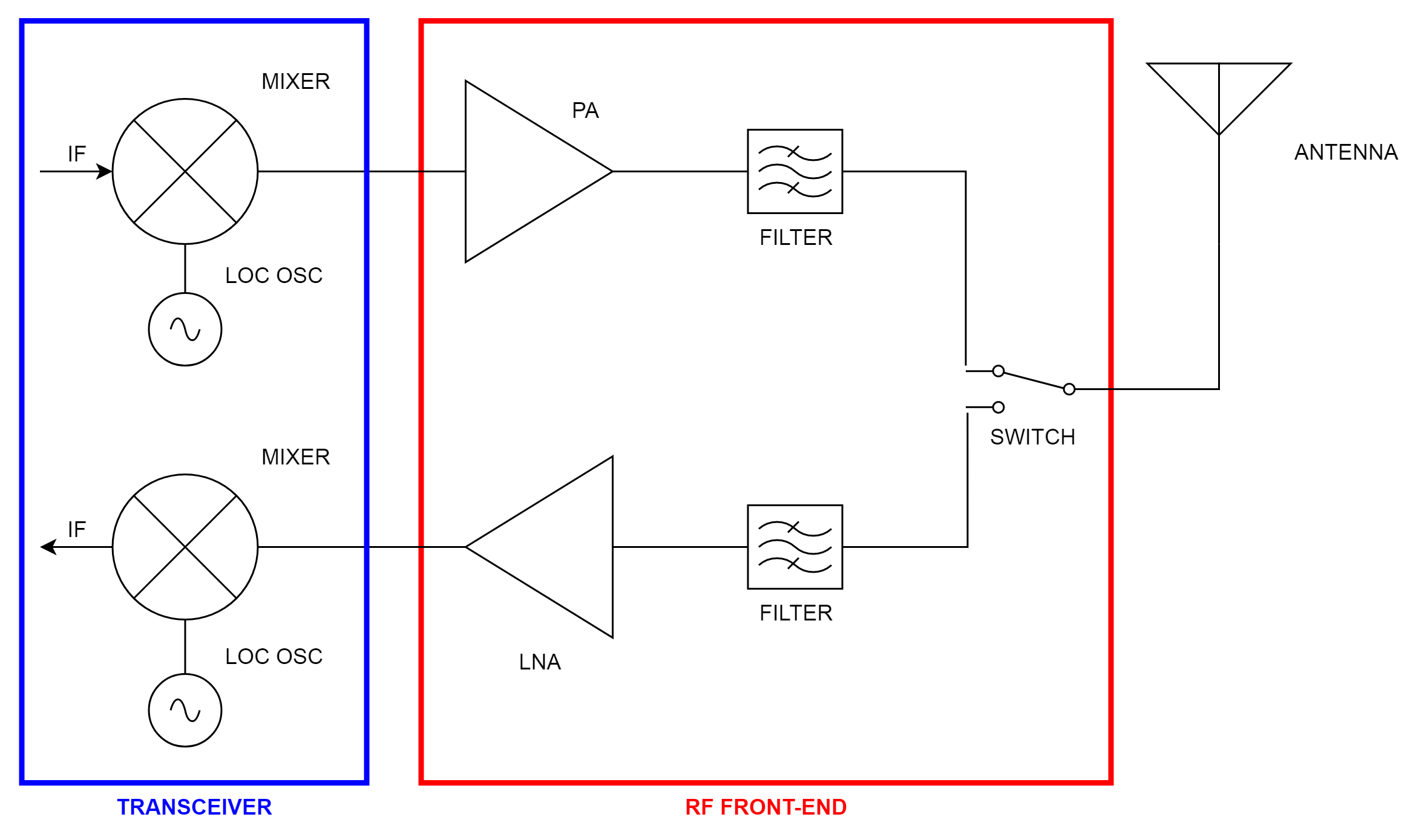 Figure 1: RFFE simplified block diagram. The RFFE includes a PA, LNA, filters, and a switch to toggle between the Rx and Tx path. The antenna can be a MIMO type. Click for a larger image. (Source: Stefano Lovati)