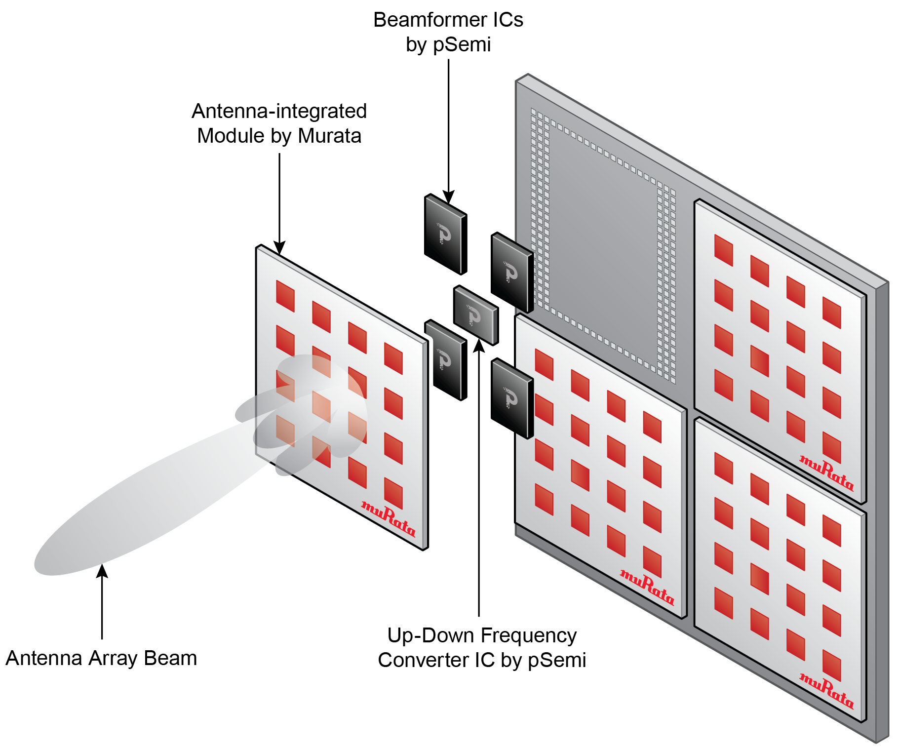Murata and pSemi have also co-designed a 5G mmWave antenna-integrated module that supports the 28-GHz band. In a 4 × 4 antenna array, each module integrates high-performance antennas and pass-band filters with pSemi beamforming ICs and an up-down converter. Multiple modules can be combined, allowing designers to quickly scale and build antenna arrays of any size.