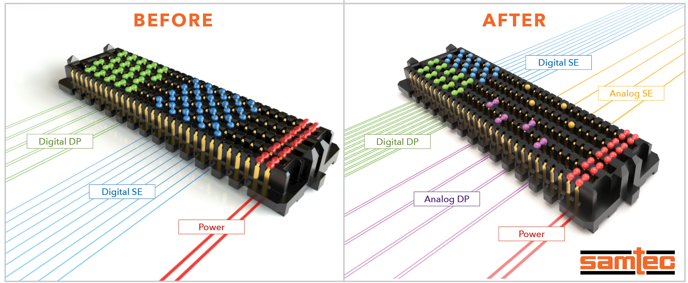 Samtec’s Analog over Array technology adds analog differential pairs and single-ended signals. (Source: Samtec, Inc.)