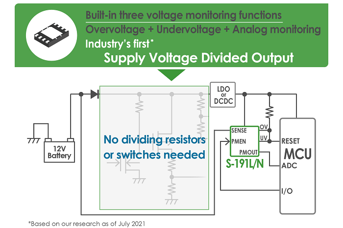 The S-191L/N automotive battery monitoring ICs are used to monitor voltage in an electronic control unit (ECU) with a supply voltage divided output. The device divides high voltage into low voltage to output a voltage that can be directly input to an A/D converter, said Ablic.