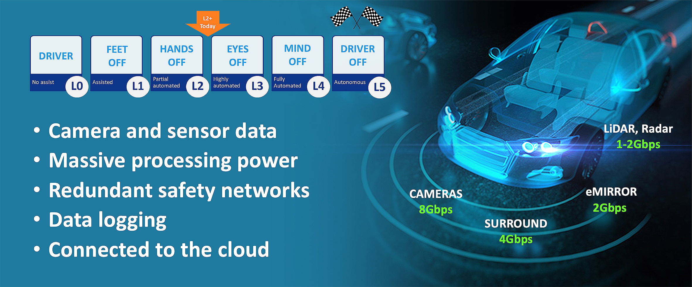 At Level 1 and 2 of the SAE definitions, drivers are still considered to be driving the vehicle and retain responsibility for the safety of the passenger and vehicle. OEMs are now planning the transition to Level 3 (in which the driver conditionally relinquishes responsibility for controlling the vehicle to the ADAS system) and even Level 4 (in which these hand-over conditions are further reduced).