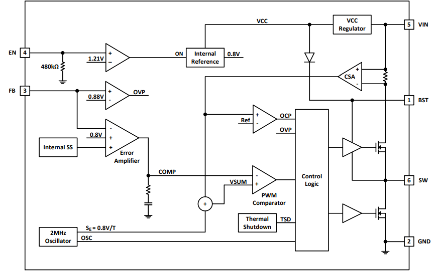 The buck converter incorporates other features that enable further overall component reduction. These include the synchronous rectification, which eliminates the need for an external Schottky diode, and the use of a peak current mode control and built-in loop compensation network.