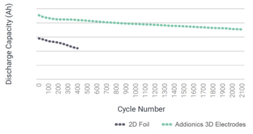 Figure 2: Addionics’s 3D electrode technology has been proven to increase battery lifetime. (Source: Addionics)