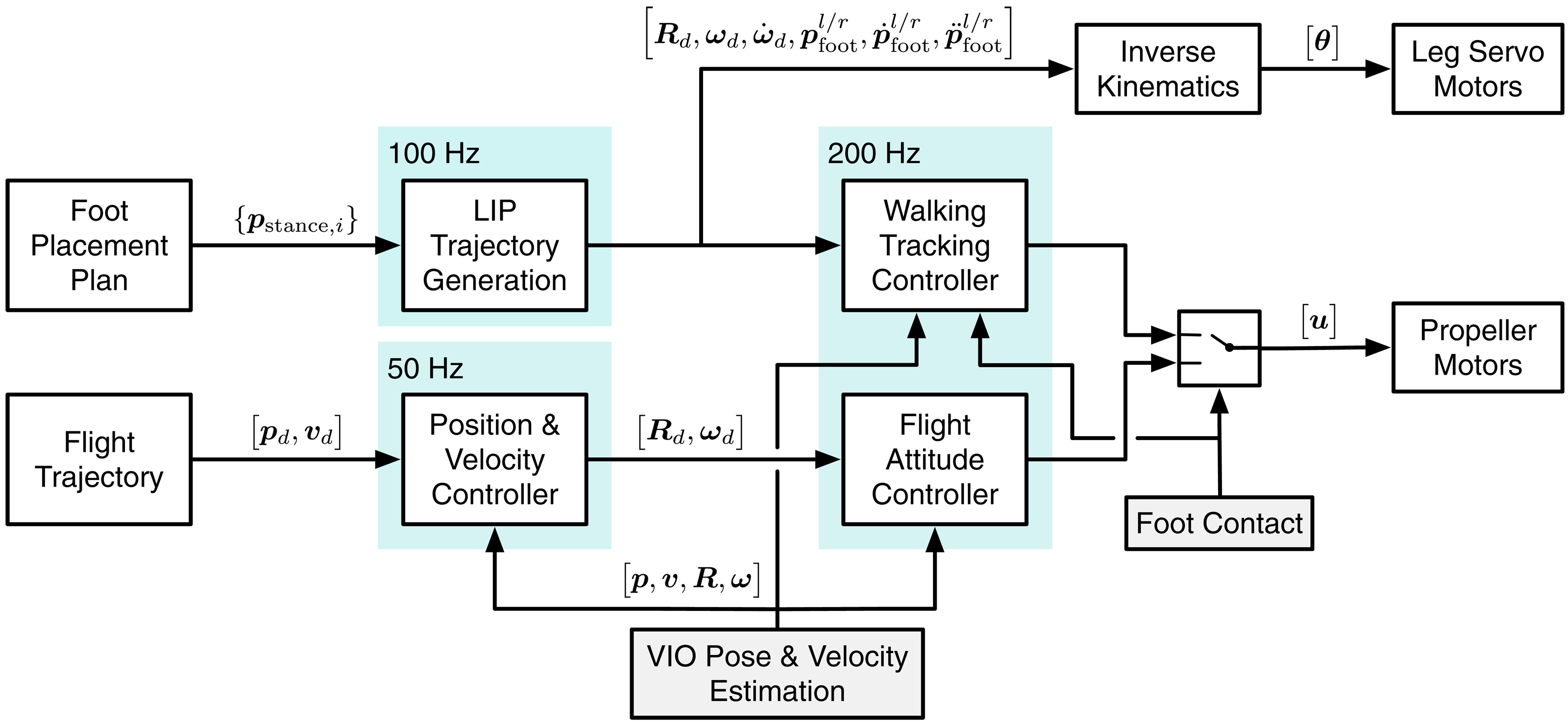 The torso, which connects the arms and legs into one assembly, houses two on-board computers, multiple sensors, and two lithium polymer (LiPo) batteries for powering the system. One computer interfaces with the sensors, receives commands, estimates states based on the sensor readings, and computes the trajectories. The second computer, which runs the walking and altitude flight controllers, interfaces directly with the leg actuators and the propeller motor controller as well as an inertial measurement unit for low-latency attitude information.