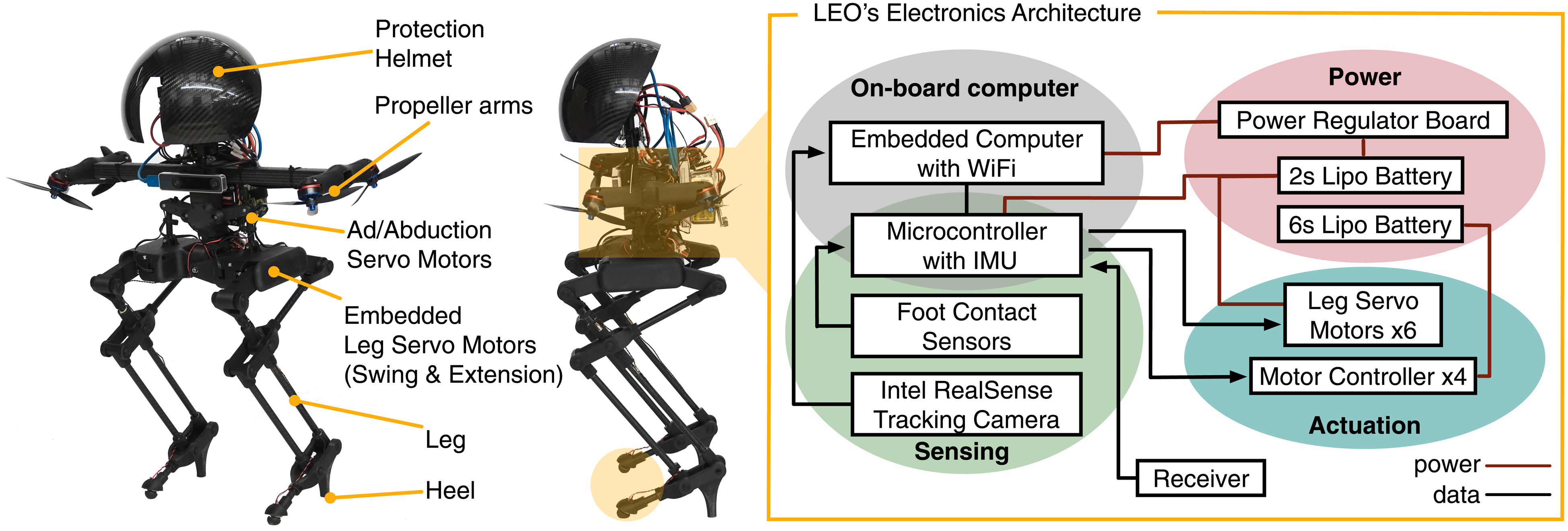 “Compared with a ground robot, LEO can overcome any obstacle using the transition between its ground and flying modes or easily reach an elevated location using propellers,” the researchers commented in the paper. “In addition, whereas an aerial robot can hover over targets, LEO can use its ground locomotion to approach them for closer inspection. When LEO is in ground contact or walking, it can also reject large disturbances and prevent falling even on extremely slippery surfaces by using synchronized control of its distributed propellers and leg joints, thereby allowing for more robust and precise walking motion.”