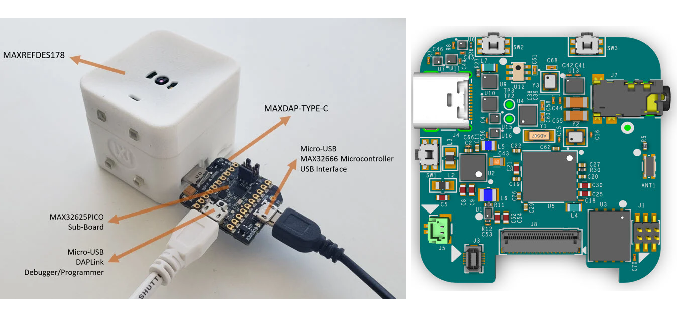 Enabling ultra-low-power internet of things (IoT) devices to implement hearing and vision, the MAXREFDES178# is comprised of the MAX78000 low-power microcontroller with a neural network accelerator for audio and video inferences, the MAX32666 ultra-low power Bluetooth microcontroller, and two MAX9867 audio CODECs.