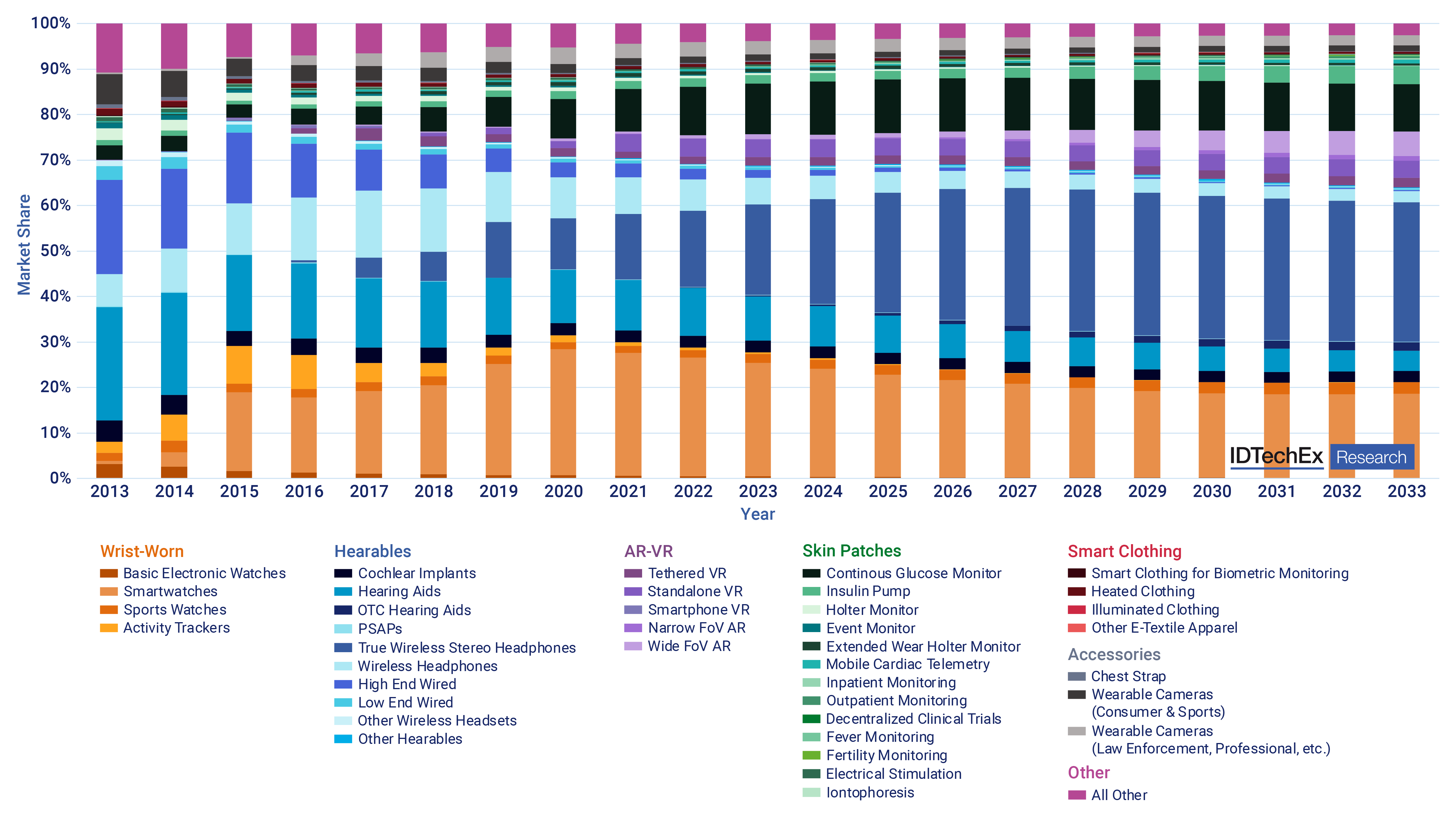 Wearable applications range from wrist-worn, AR/VR and hearables to skin patches and smart clothing. (Source: IDTechEx)