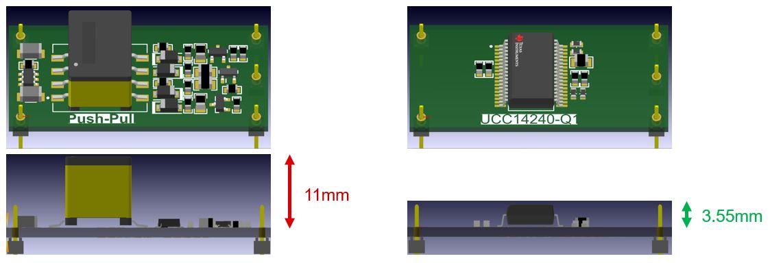 Isolated power transfer in an IC-sized package: Legacy push-pull architecture with bulky transformers in a 11-mm height (left) and the UCC14240-Q1 with an integrated transformer in a 3.55-mm height package (right). (Source: Texas Instruments)
