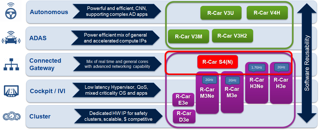 The R-Car series of SoCs from Renesas addresses a variety of automotive applications, such as autonomous driving, ADAS, connected gateway, in-vehicle infotainment, cockpit and dashboard/cluster. All processors in the R-Car family (see Figure 3) support software reusability as well as the ISO 26262 safety standard up to ASIL-D. Moreover, along with its partners, Renesas provides a wide range of software and development tools to meet the complex and large-scale software development requirements expected by the automotive sector.