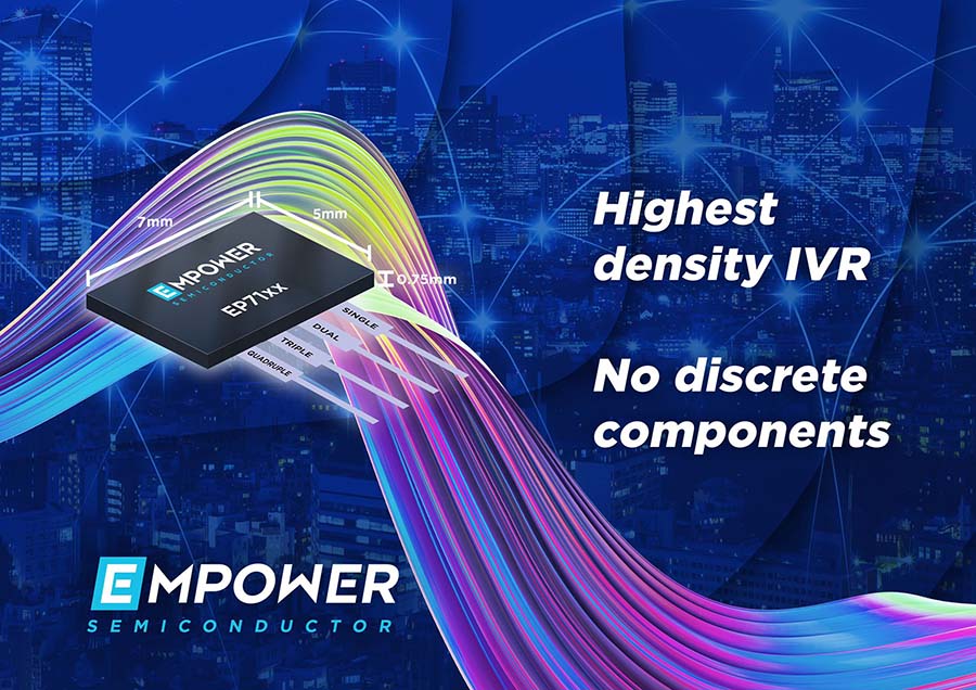 Empower Semiconductor, Inc. has introduced its first series of quad-output step-down converters to its family of integrated voltage regulators (IVRs) that combine high current density and efficiency, fast dynamic voltage scaling (DVS) and transient response, and fault protection. The new digitally configurable EP71xx series can deliver complete voltage regulation and protection functionality without the need for external discrete components, while reducing other system components and cost thanks to their high integration, said the company.