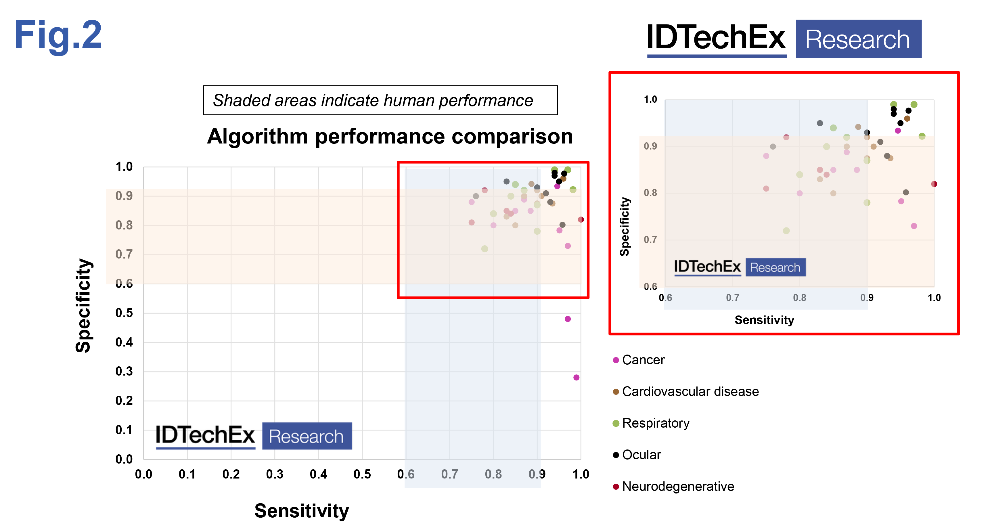 Image-recognition AI in medical diagnostics: performance comparison by application versus human performance (Source: IDTechEx) Click for larger image.