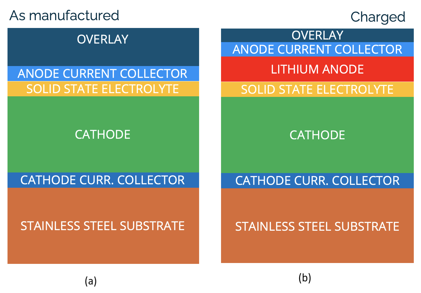 Figure 1. Diagram of material composition of a solid-state lithium microbattery: (a) discharged/as-manufactured state and (b) pre-charged/charged state. (Source: Ensurge Micropower)