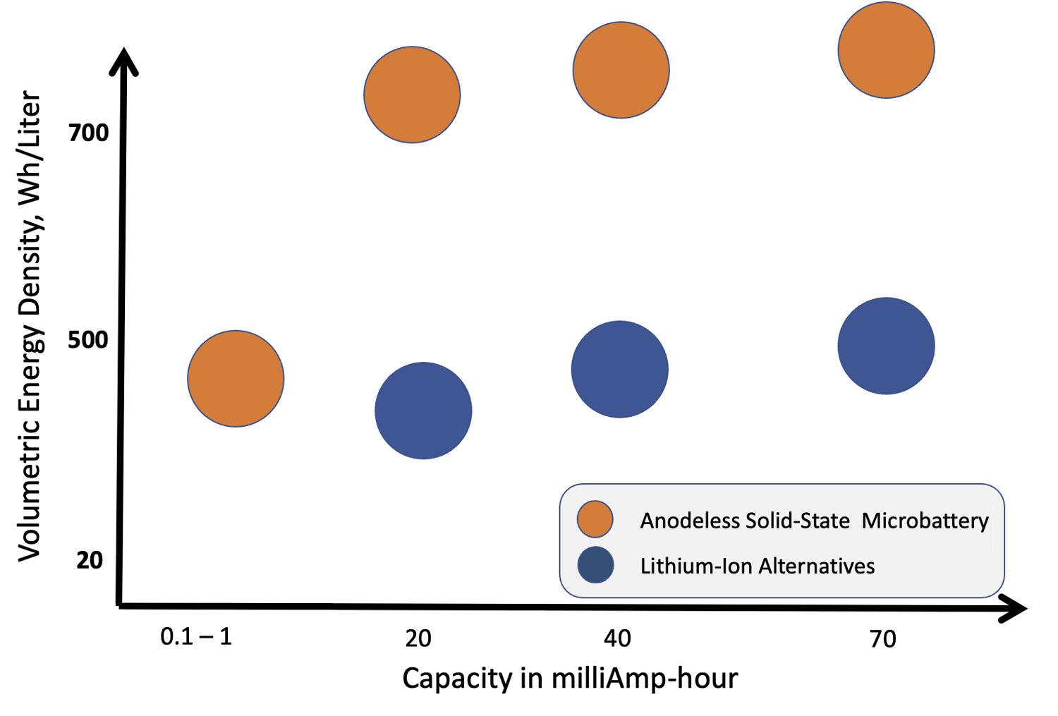 Figure 2: Tests show that the best-performing anodeless solid-state microbattery technology delivers higher VED than Li-ion alternatives. (Source: Ensurge Micropower)
