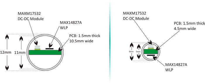 Fig. 5 shows that for a 12-mm diameter housing, the transceiver in a wafer level package (WLP) and the DC-DC can sit side by side on a regular PCB which has 10.5-mm width. There is still room for vias and wires on the same side. If the sensor housing is 6 mm, then the PCB width is down to 4.5 mm. Then the chips must be mounted on both sides of the PCB even with small WLP packages.