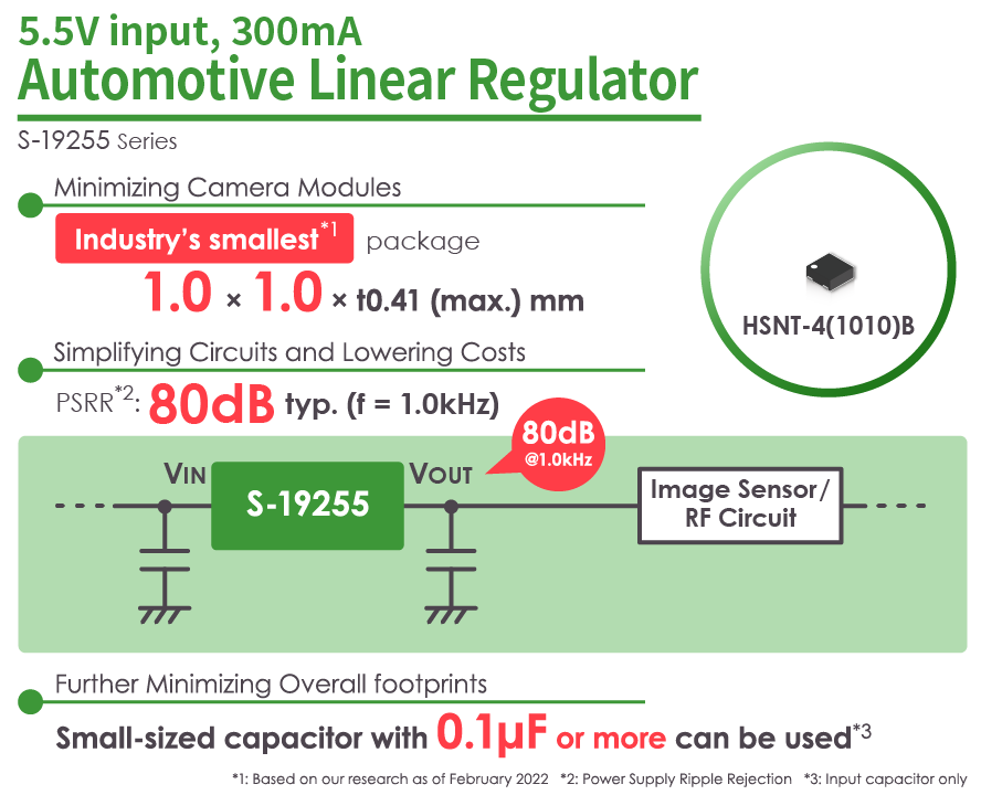 Ablic Inc. has introduced its new S-19255 Series of automotive low-dropout (LDO) linear regulators. Claiming the smallest high power supply rejection ratio (PSRR) LDO linear regulators, the S-19255 devices are housed in a HSNT-4(1010)B package, measuring 1.0 × 1.0 x 0.41 mm, enabling them to fit into smaller camera modules.