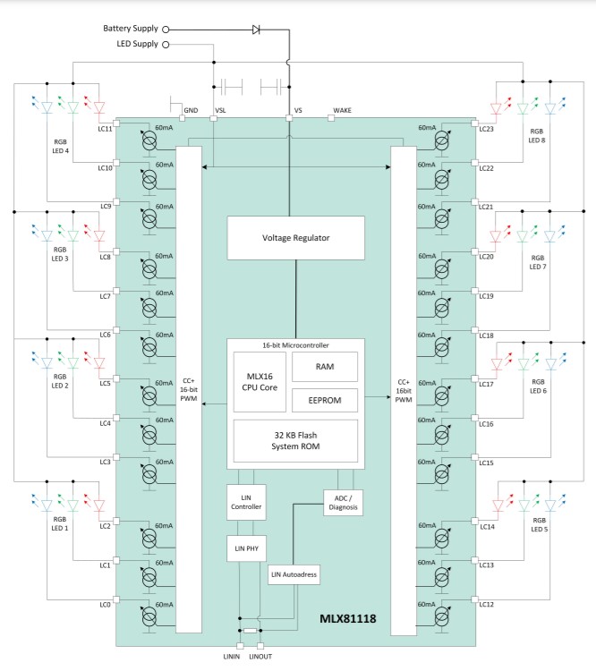 Designed for ambient lighting and animated lighting applications in a LIN system, each of the 24 outputs of the MLX81118 is capable of sourcing up to 60 mA. The independent PWM control, configurable up to 16-bit resolution, allows the controller to achieve any color point and brightness level.