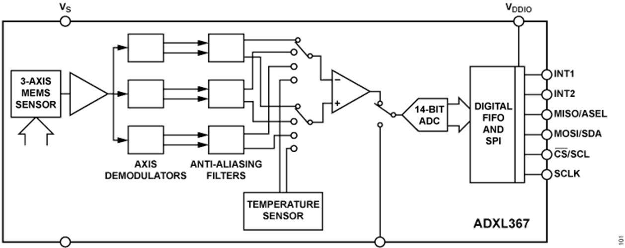 The ADXL367 operates with supply voltages as low as 1.1 V (1.1 V to 3.6 V), which allows for single-cell battery operation without external boost converters, and delivers 200-nW motion detection in wakeup mode and 970 nW in measurement. The device includes a deep multimode output first in, first out (FIFO), a built-in micropower temperature sensor, an internal analog-to-digital converter (ADC) for synchronous conversion of an additional analog input, single-tap and double-tap detection, and a state machine to prevent a false triggering. It also offers provisions for external control of the sampling time and/or an external clock.
