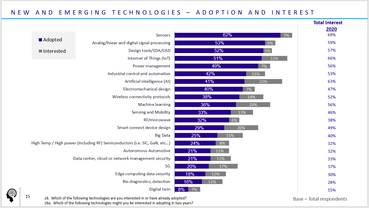 Not surprisingly, when asked which new technologies you’ve already adopted and are interested in adopting over the next two years, sensors led by a big margin. Analog/linear and digital signal processing followed in the category of already adopted, and artificial intelligence took the lead for the technology most interested in adopting over the next two years.