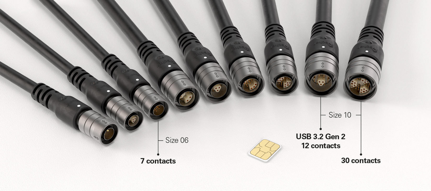 The new pin-layout configuration offers seven contacts (4× signal, 3× power) in a 10-mm receptacle (size 06), supporting up to 22 AWG and three locking mechanisms (quick-release, push-pull, screw). The new 14.0-mm (size 10) body size with 12 signal and power contacts offers high power up to 8 A and supports USB 3.2 Gen 2 (10 Gbits/s, 1 m), making it suited for high-speed intercom boxes and hubs.