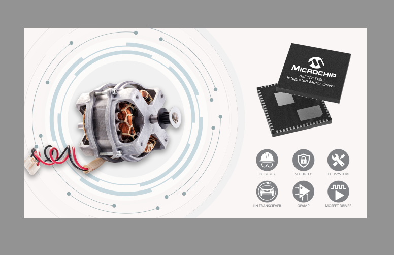 Microchip Technology Inc. has announced a new family of dsPIC digital signal controller (DSC)-based integrated motor drivers. These devices combine a dsPIC33 DSC, a three-phase MOSFET gate driver and an optional LIN or CAN FD transceiver in one package. This integration enables a reduction in component count of motor control system designs, smaller printed circuit board (PCB) dimensions and reduced complexity. The devices are supported by development boards, reference designs, application notes and the company’s field oriented control (FOC) software development suite, motorBench Development Suite V2.45.