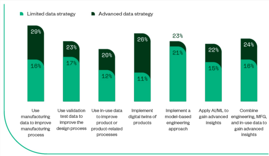 Even though 65% believe a data strategy is essential to optimize the product lifecycle, 47% of companies use a limited data strategy, only 29% of companies with advanced data programs are fully capable of using manufacturing data to improve manufacturing processes, and only 24% are combining engineering, manufacturing, and in-use data to gain advanced insights. In addition, 74% of companies are not using product data to implement digital twins.