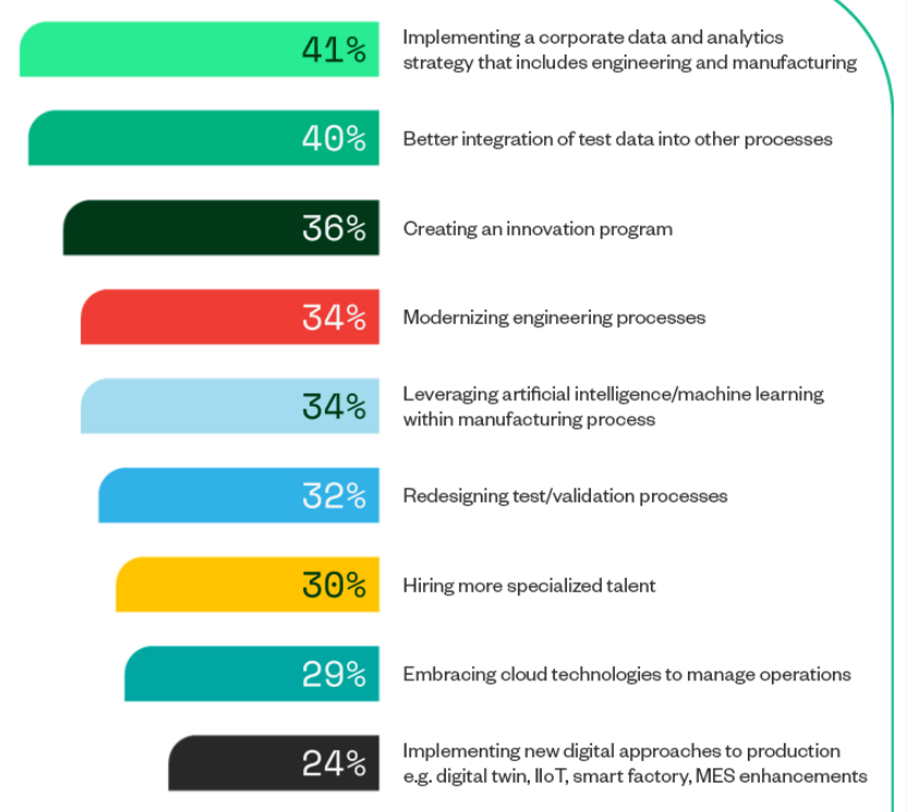 Other top initiatives include implementing a corporate data and analytics strategy that includes engineering and manufacturing (41%), creating an innovation program (36%), modernizing engineering processes (34%), and leveraging artificial intelligence/machine learning in the manufacturing process.