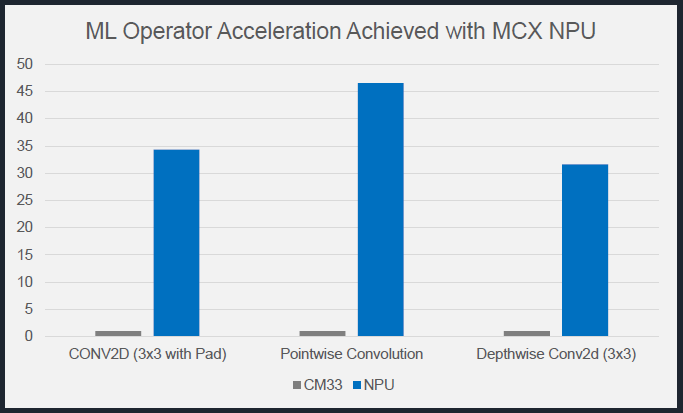 The MCX NPU delivers over 30× relative acceleration for basic ML operations when compared with the Cortex-M33 core. (Source: NXP Semiconductors)