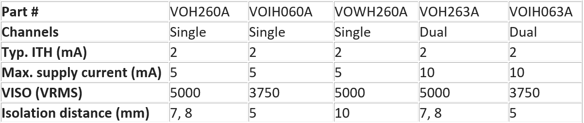 Other specs include a maximum rated withstand isolation voltage up to 5000 VRMS and isolation distances from 5 mm to 10 mm to cover a range of requirements, including applications with working voltages that exceed 1000 V.