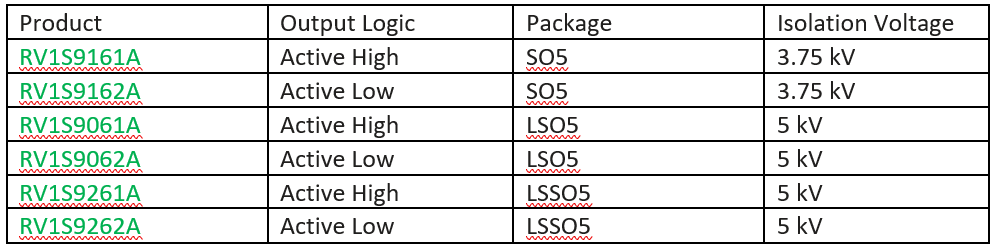 All six new RV1S9x6xA family photocouplers are available now. Here is the lineup: