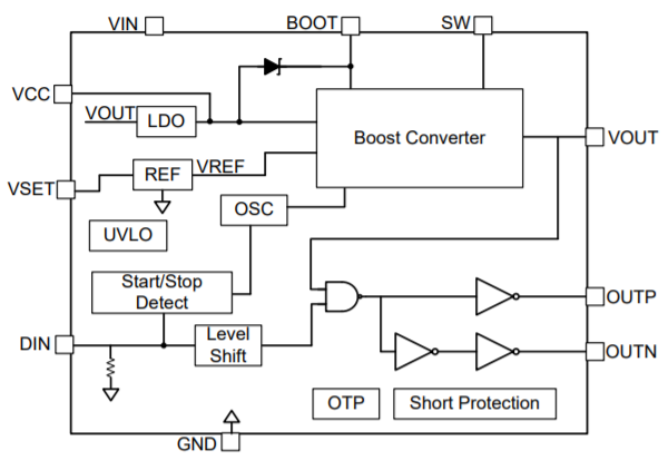 The integrated boost converter operates at a typical frequency of 1.8 MHz and the output can be set to either 11 V or 15.6 V with a minimum number of external components for various applications, said the company.