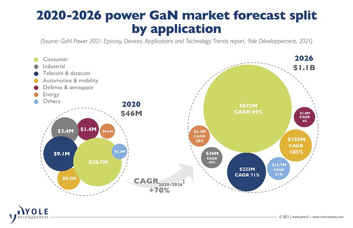 There has been a lot of activity in the GaN market with many of the key players jockeying for more market share. Though many of the end market applications are relatively small today, the GaN power market is expected to double over the next five years, and reach $1.1 billion in 2026, according to Yole Développement. One of the biggest growth markets is fast chargers for smartphones.
