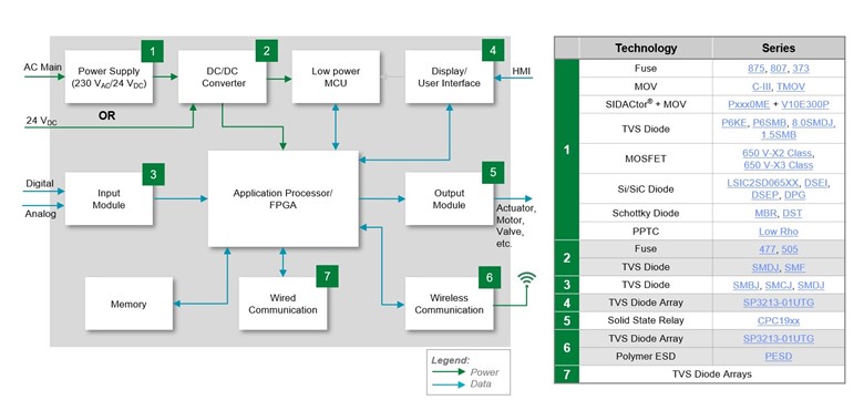 Figure 2 shows a general block diagram of a PLC. The table to the right of the block diagram lists the component types that can protect the PLC from hazards such as overcurrent conditions, high-voltage transients, and ESD. The table also includes components that can reduce the PLC’s power consumption. The following paragraphs present the need for each component in the specific circuit blocks and offer recommendations on their characteristics.