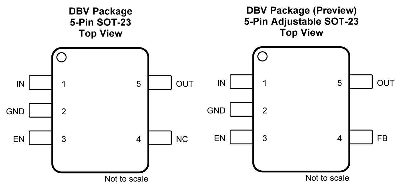 Figure 1: TLV755P (left) and TLV758P (right) pinouts (Source: Texas Instruments) Click for larger image.