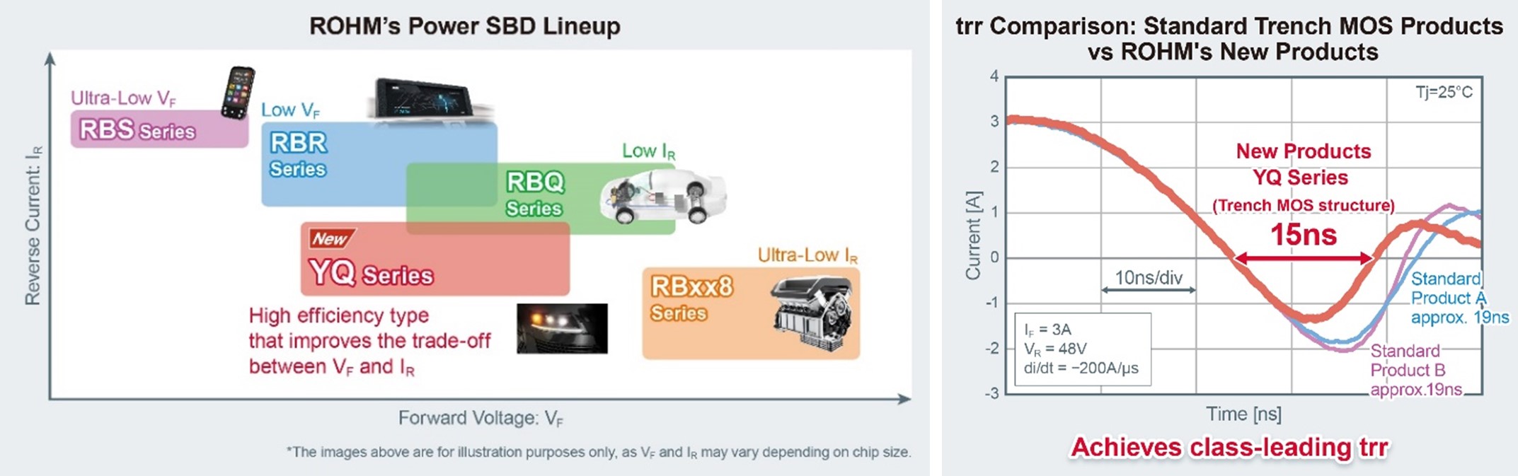 The new YQ series is Rohm’s first SBD family to adopt a trench MOS structure, achieving class-leading trr of 15 ns and reducing trr loss by approximately 37% and overall switching loss by approximately 26% over general trench-type MOS products. This also helps to lower application power consumption, Rohm said.
