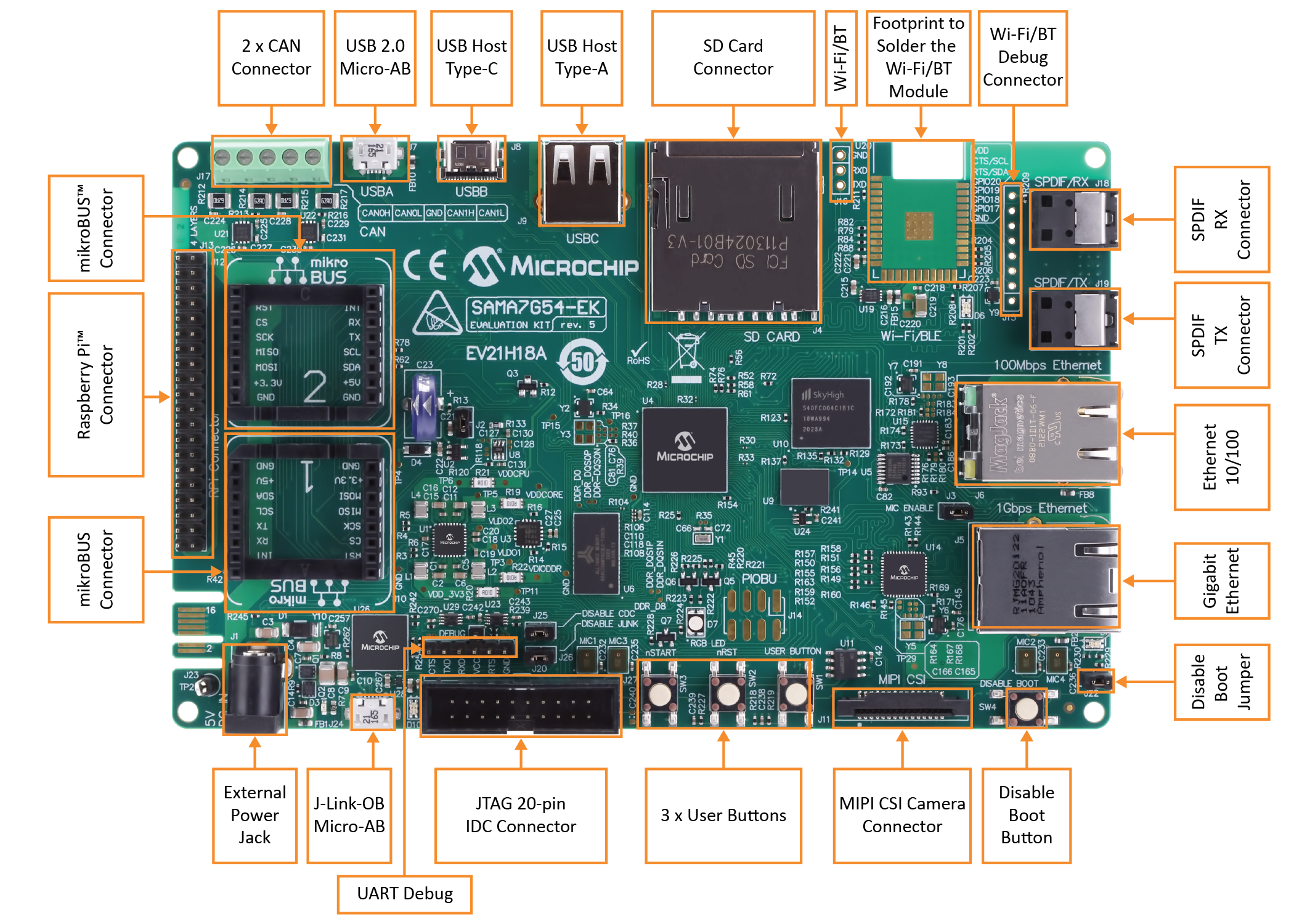 Microchip provides both hardware and software development support for the SAMA7G54. The SAMA7G54-EK Evaluation Kit (CPN: EV21H18A) features connectors and expansion headers for customization and quick access to embedded features. The device is supported by Microchip’s mainline Linux distribution and bare-metal framework and RTOS support is provided within MPLAB Harmony v3.