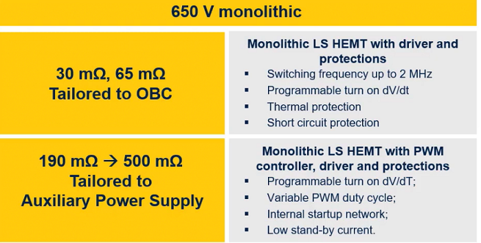 The first members of the 650-V family are segmented into devices for OBC and auxiliary power supply applications. The low-ohmic OBC devices are 30 mΩ and 65 mΩ fully monolithic low-side (LS) HEMTs with integrated driver and protection circuits, so not only the power stage, but also their control use GaN technology, said Marquina.