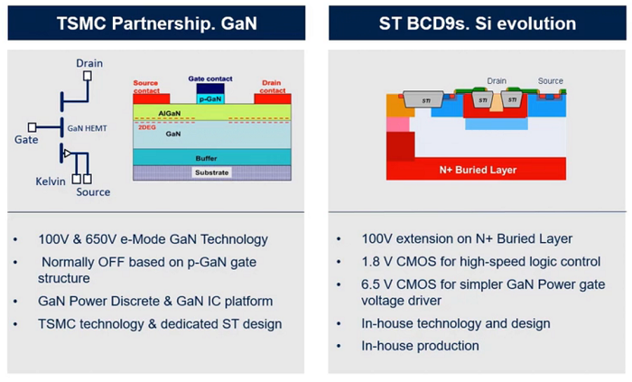 TSMC provides the GaN technology, including 100-V and 650-V e-Mode GaN, and because it is based on a p-GaN gate structure, the device is normally off, which is very important for automotive applications, said Marquina. “ST is providing a dedicated unique design with its own design rules. For the 100-V devices we go a step further, and in a system-in-package approach, we integrate logic with our latest silicon-based technology, the BCD9 technology. This provides a simpler GaN power gate voltage driver, while at the same time enabling high-speed logic control.”