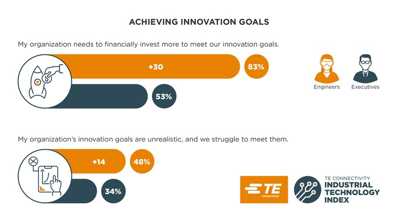 The challenges start at how they define innovation, said TE. Fifty-seven percent of executives said innovation is a total transformation, compared with 45% of engineers. Also, nearly half of the engineers said their organization’s goals for innovation are unrealistic and that they struggle to meet them, compared with 34% of executives.