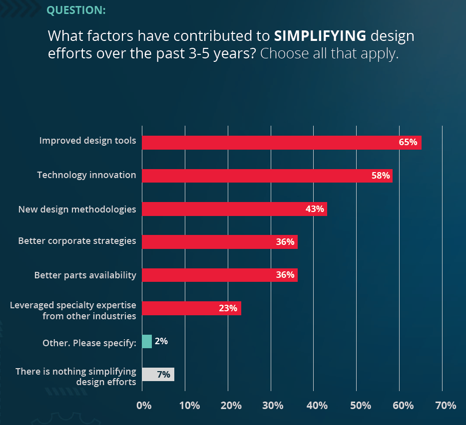 When asked what factors have simplified their design efforts over the past three to five years, the majority of survey respondents said improvement in design tools (65%) and technology innovation (58%), followed by new design methodologies (43%), better corporate strategies (36%), and better part availability (36%).
