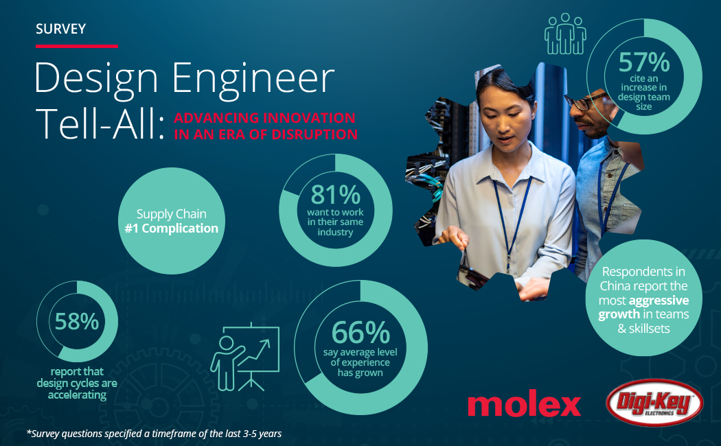 Improvements in design tools, tech innovation, and new design methodologies have simplified design efforts over the past three to five years, according to a survey of global design engineers. The global survey, commissioned by Molex and Digi-Key, also finds there are a number of factors that hinder design engineering progress and innovation, including supply chain issues, higher customer expectations, and increased design complexity.