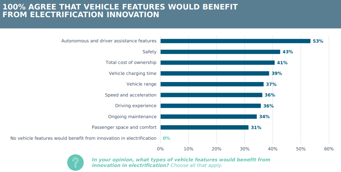 A majority of respondents believe that electrification will deliver improvements to several vehicle features including autonomous and driver assistance (53%), safety (43%), total cost of ownership (41%), vehicle charging time (39%), and vehicle range (37%). Still, challenges persist in improving vehicle charging time (31%), vehicle range (29%) as well as autonomous and driver assistance (29%).