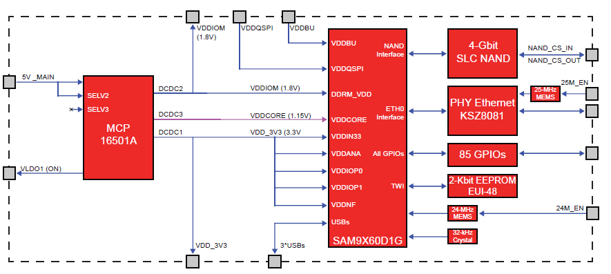 Other features include a 10/100 KSZ8081 Ethernet PHY and a 1 Kb Serial EEPROM with pre-programmed MAC address (EUI-48). Designs can be customized based on the required level of security protections such as secure boot with on-chip secure key storage (OTP), hardware encryption engine (TDES, AES and SHA), and True Random Generator (TRNG).