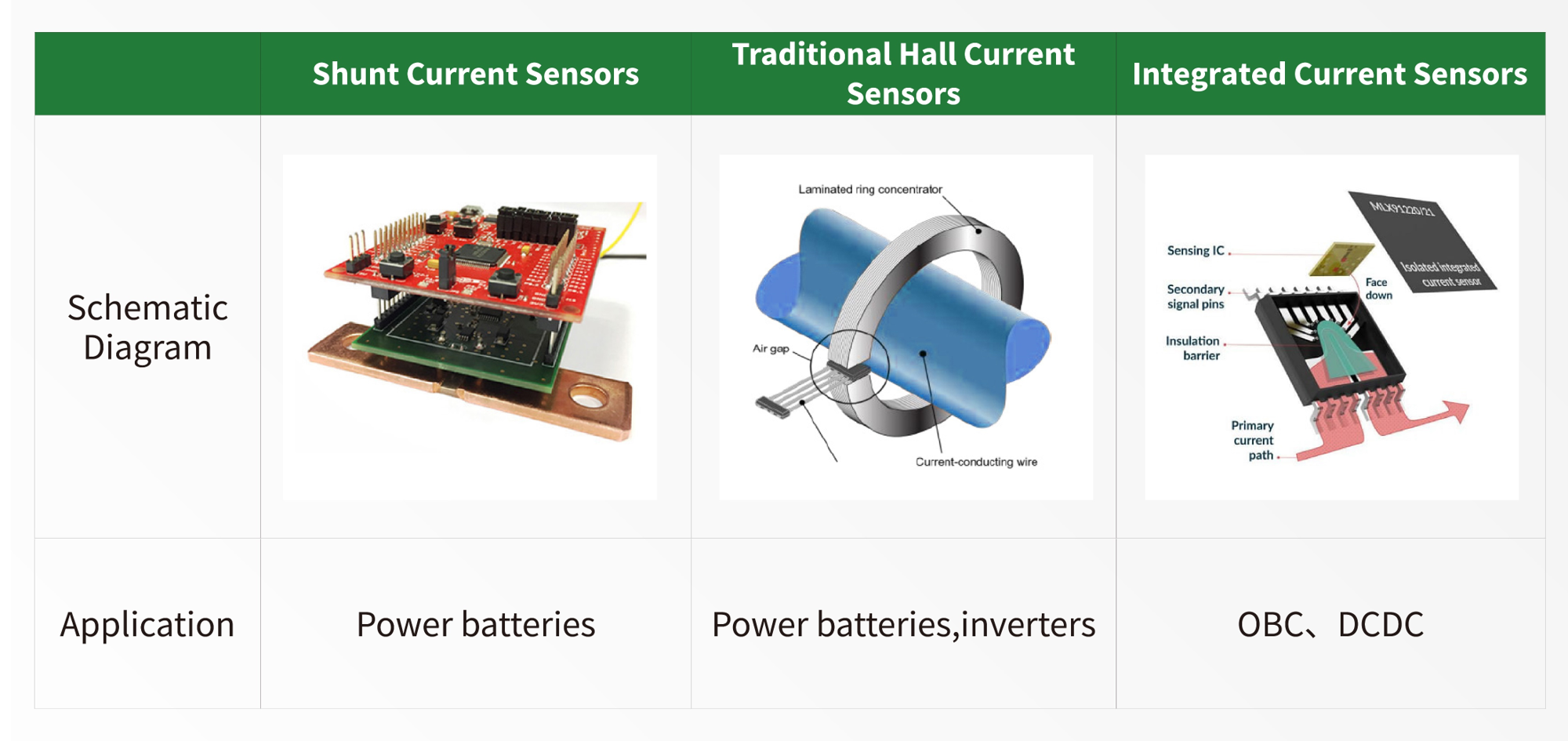 The different types of current sensors available and where they are most commonly used in EV applications (Source: Novosense Microelectronics)
