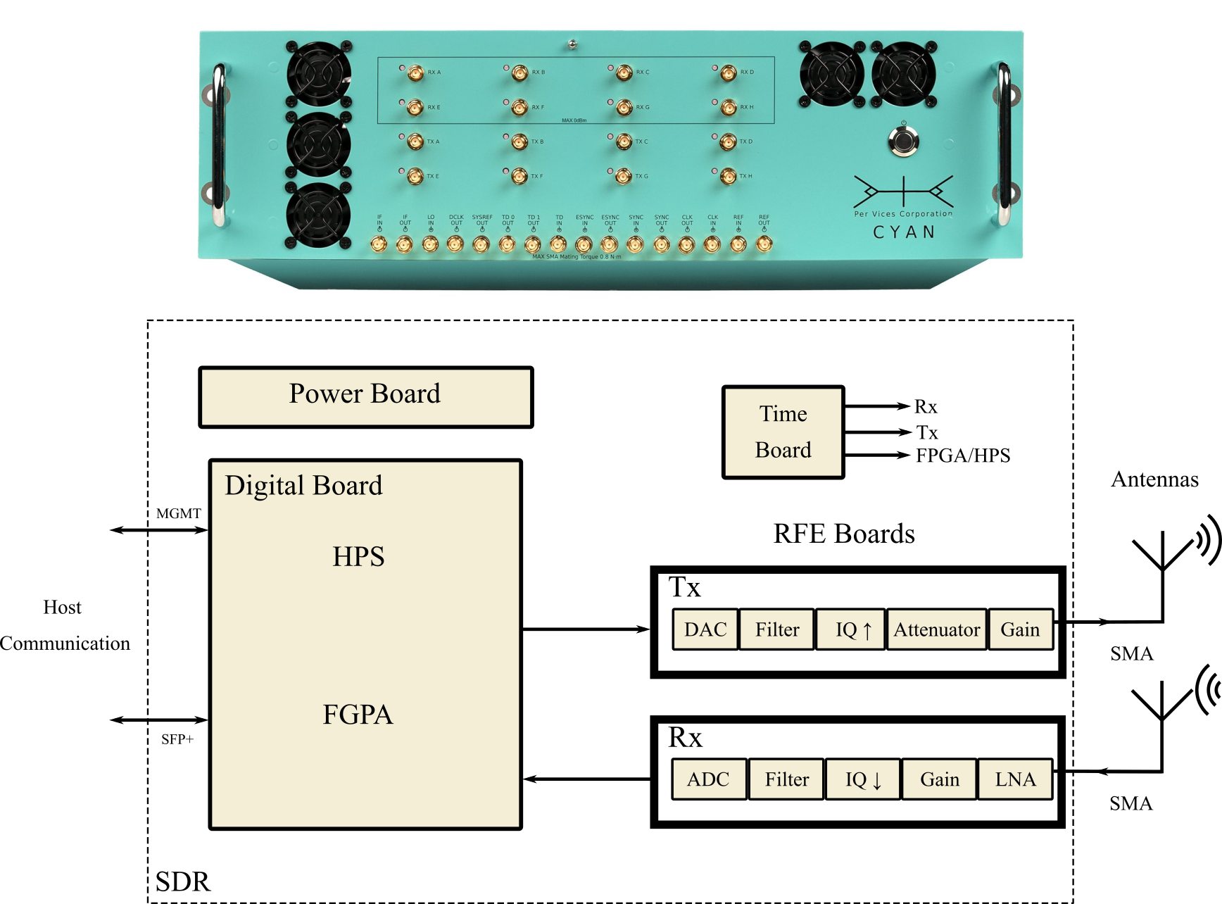 Figure 1: External layout and interfaces, components, and internal boards of a high-end SDR (Source: Per Vices)