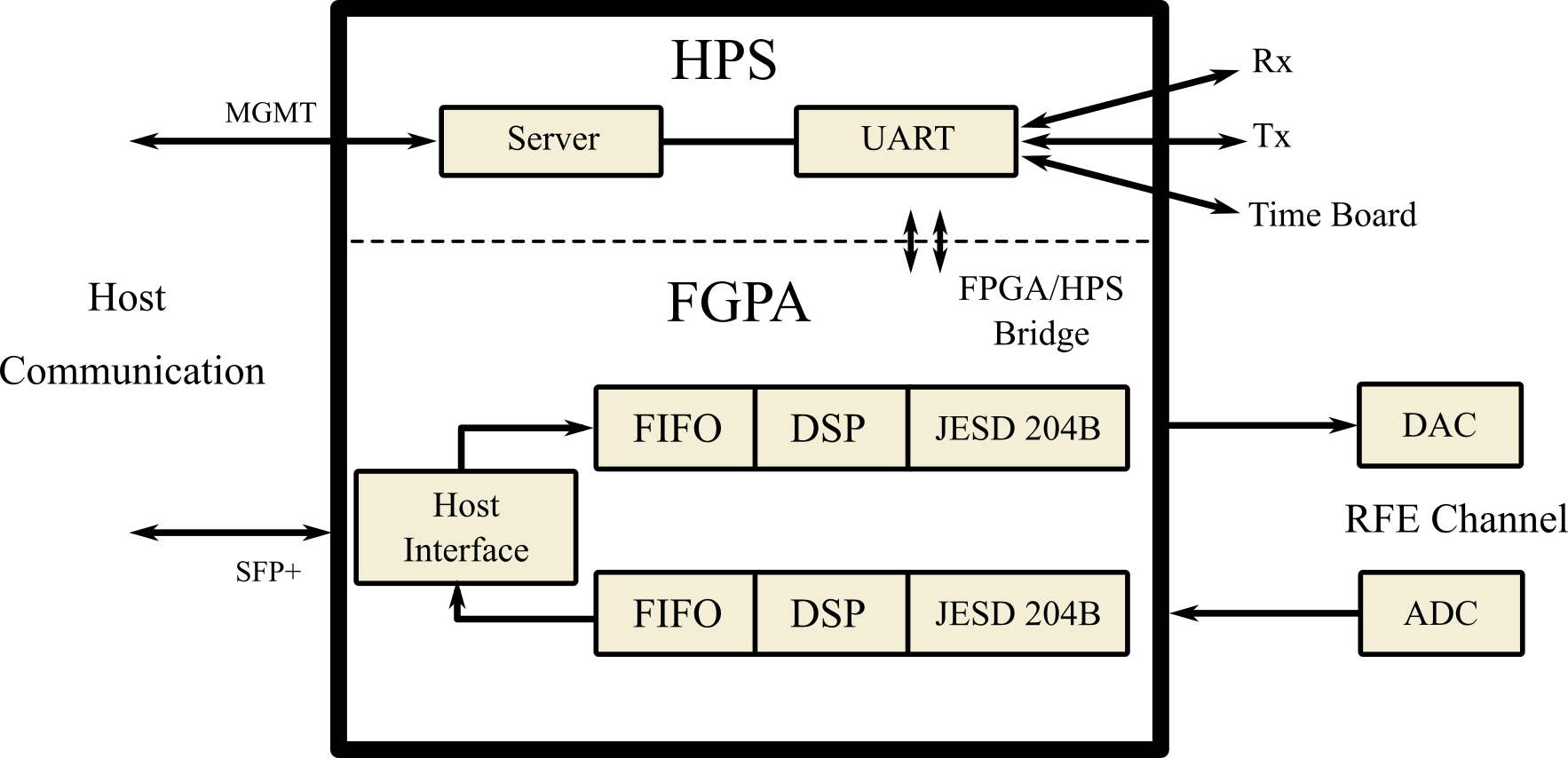 Figure 2: Digital board architecture showing how the host interfaces with the FPGA, RFE, and other components (Source: Per Vices)