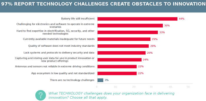 Still, automakers will face big technology challenges in delivering these innovations: 44% of survey respondents cited insufficient battery life, 36% reported obstacles getting electronics and software to operate in extreme conditions, and 36% noted difficulty finding expertise in electrification, 5G, security, and other needed technologies.