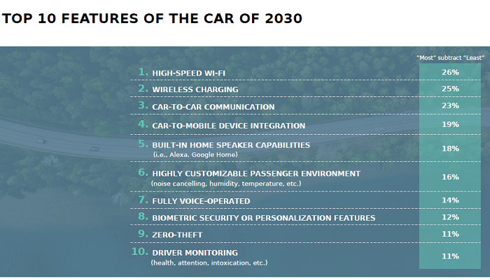 The top five features of ‘the car of 2030,’ reported by respondents, will be high-speed Wi-Fi (26%), wireless charging (25%), car-to-car communication (23%), car-to-mobile-device integration (19%), and built-in home speaker capabilities (18%).