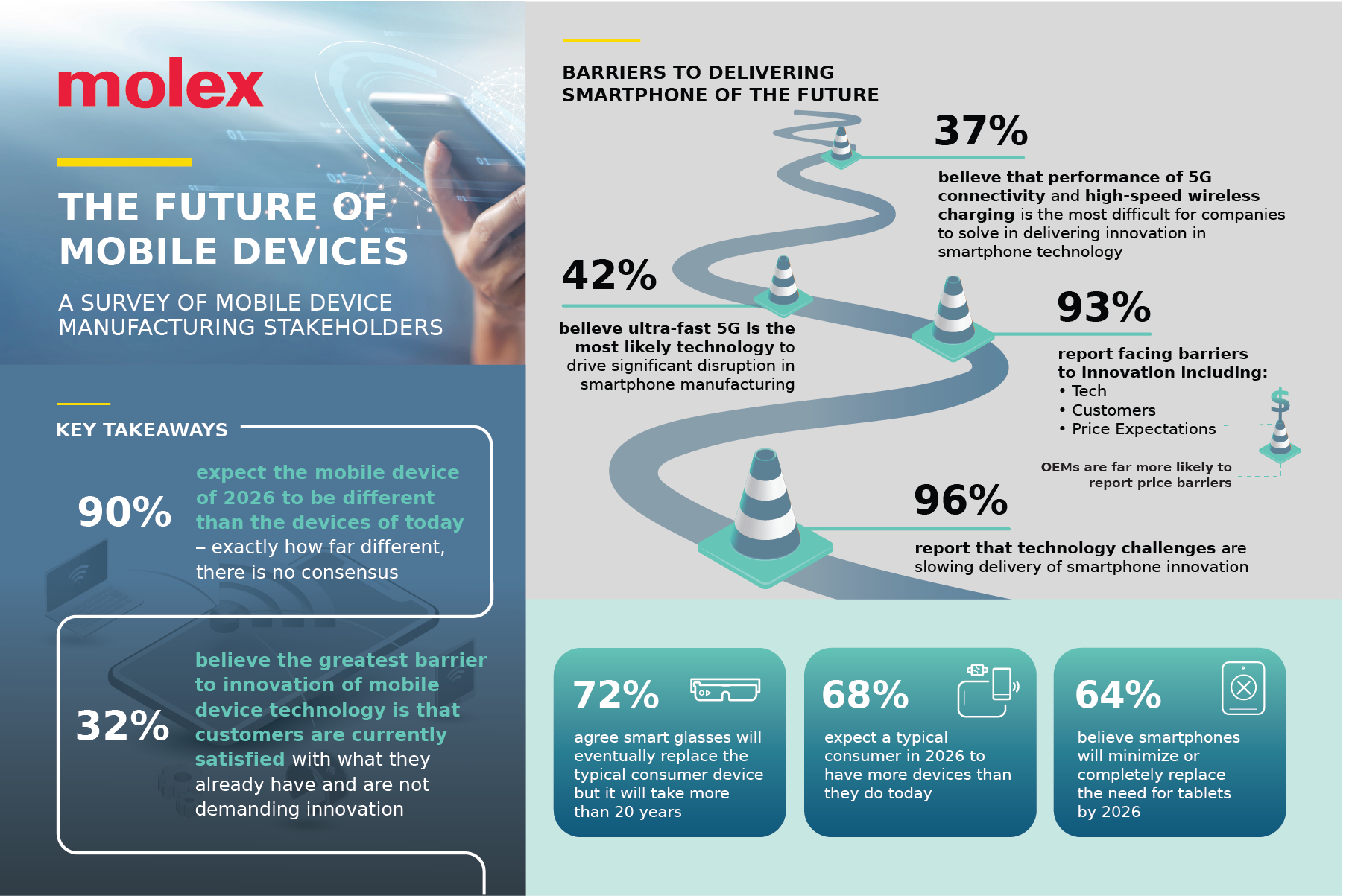 High-speed wireless connectivity and 5G cellular performance are the most difficult challenges to address, according to a survey of mobile device OEMs and suppliers. The global survey, commissioned by Molex, looks at the top trends and technologies in the mobile device industry five years out. The survey finds that form factors, disruptive features, and innovations will impact the future design of smartphones, smart wearables, and other mobile devices.