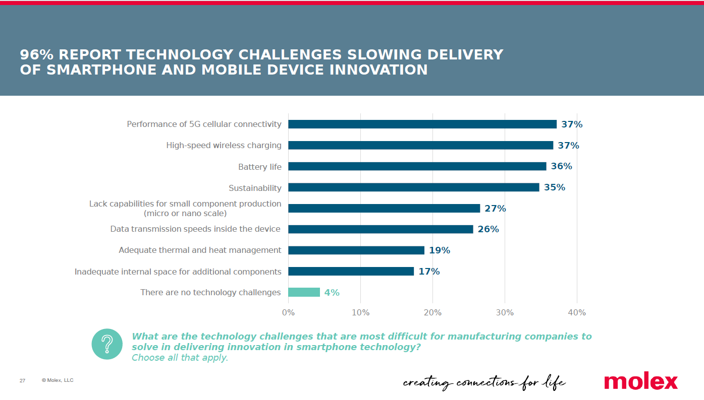According to the survey participants, the most difficult problems to address are performance of 5G cellular connectivity (37%), high-speed wireless charging (37%), battery life (36%), sustainability (35%) and inability to produce small components at the micro or nano scale (27%).