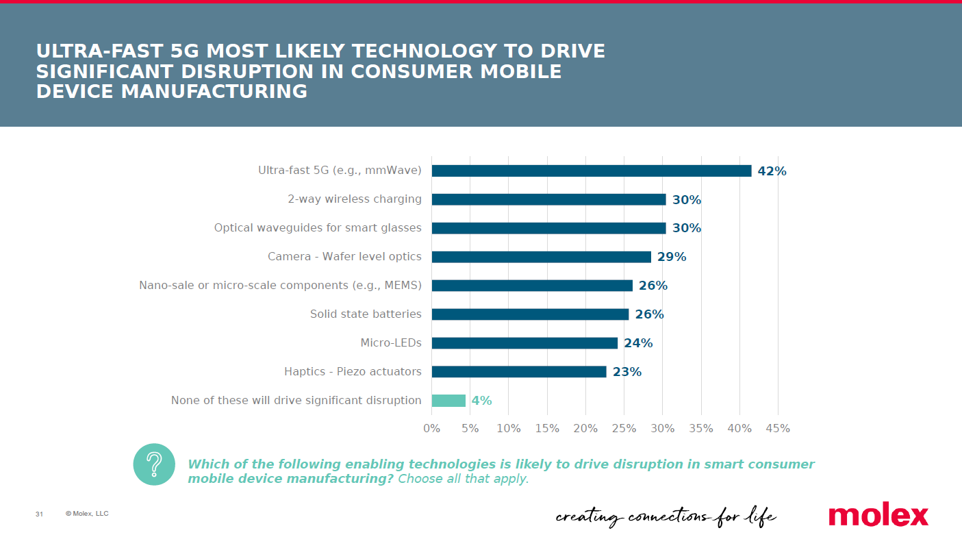The top enabling technologies that are expected to drive disruption in mobile device manufacturing include ultra-fast 5G or mmWave (42%), two-way wireless charging (30%), optical waveguides for smart glasses (30%), cameras with wafer-level optics (29%), nanoscale or micro-scale components (26%), and solid-state batteries (26%). Other technology disrupters cited include microLEDs and haptics (piezo actuators).